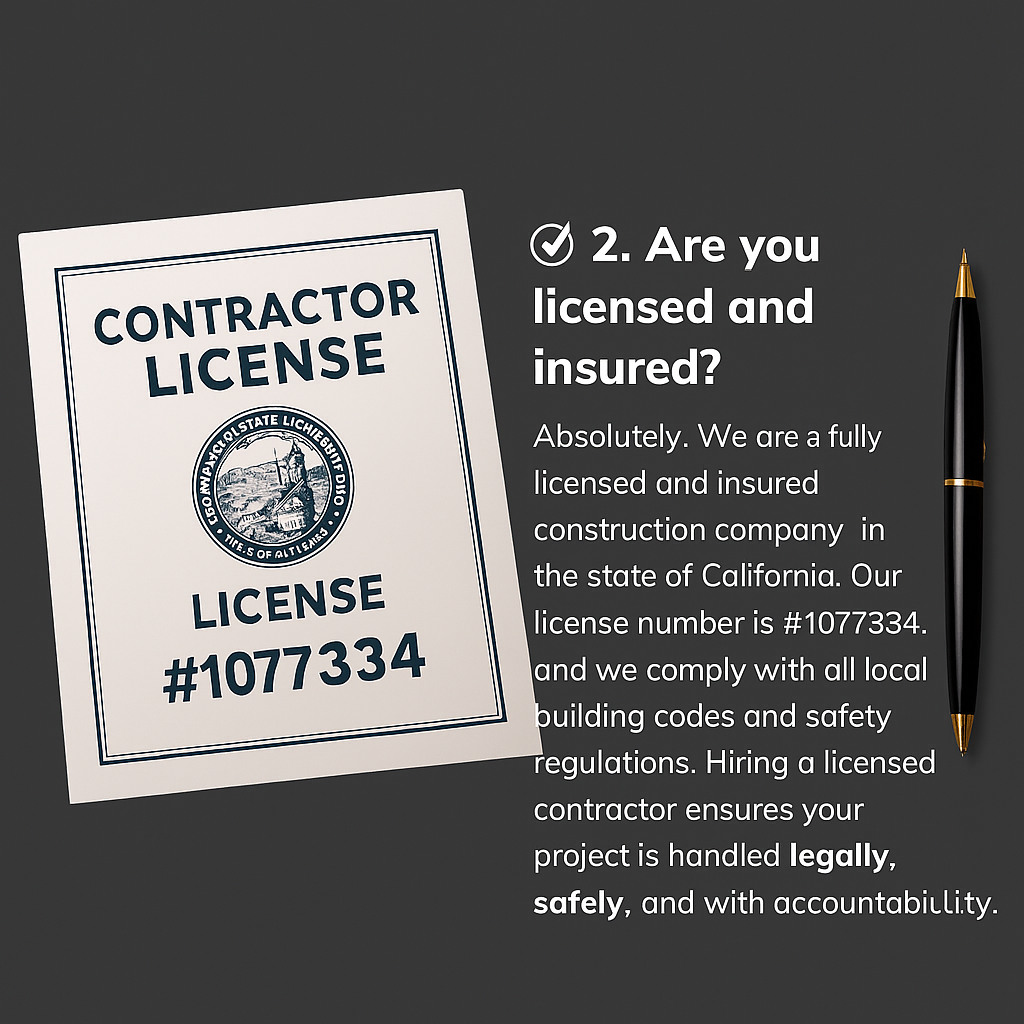Absolutely. We are a fully licensed and insured construction company in the state of California. Our license number is #1077334, and we comply with all local building codes and safety regulations. Hiring a licensed contractor ensures your project is handled legally, safely, and with accountability.