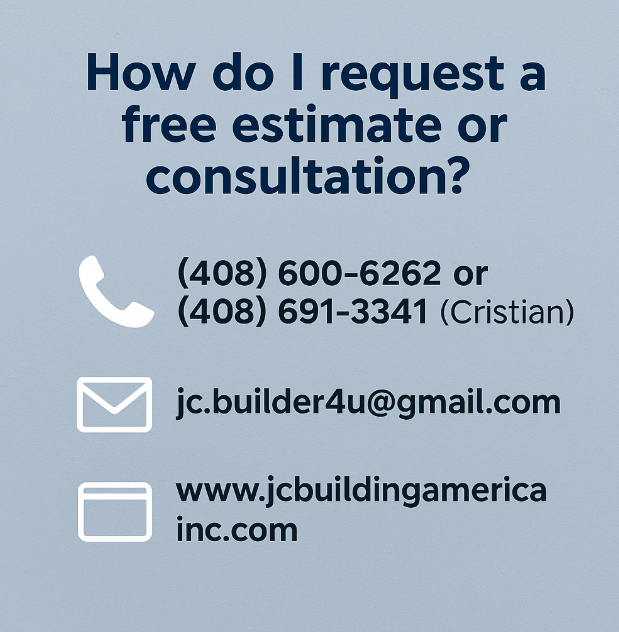 It’s easy! You can call us directly at (408) 600-6262 or (408) 691-3341 (Cristian) during our business hours (Monday–Saturday, 8 AM to 5 PM). You can also email us at jc.builder4u@gmail.com or visit our website at www.jcbuildingamericaninc.com. We’ll schedule a visit, listen to your needs, and provide a detailed, no-obligation estimate tailored to your project.